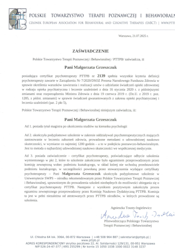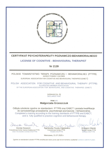 21.07.2025 – uzyskanie certyfikatu Psychoterapeuty Poznawczo-Behawioralnego nr. 2139 Polskie Towarzystwo Psychoterapii Poznawczej i Behawioralnej (PTTPB)
