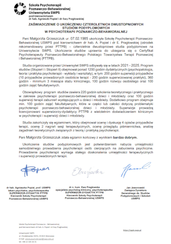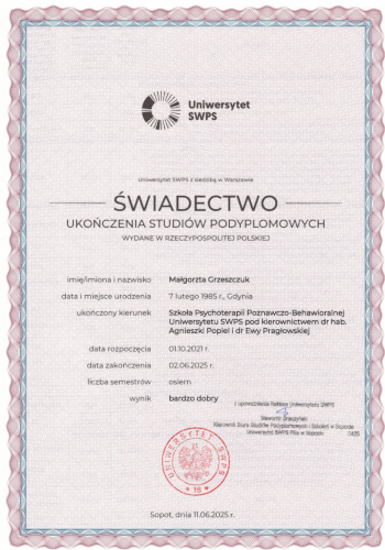 02.06.2025 – ukończenie Studiów Podyplomowych w Szkole Psychoterapii Poznawczo-Behawioralnej Uniwersytetu SWPS pod kierownictwem dr hab. Agnieszki Popiel i dr Ewy Pragłowskiej.